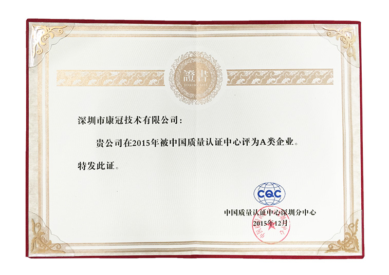 December 2015, our company won the China Quality Certification Center (CQC) "A Class Enterprise" certificate issued by Shenzhen sub-center, indicating that our business in full compliance with CQC management requirements, and passed the audition one time, and no non-conformities, it also shows that our product quality is stable and with high levels of corporate management.