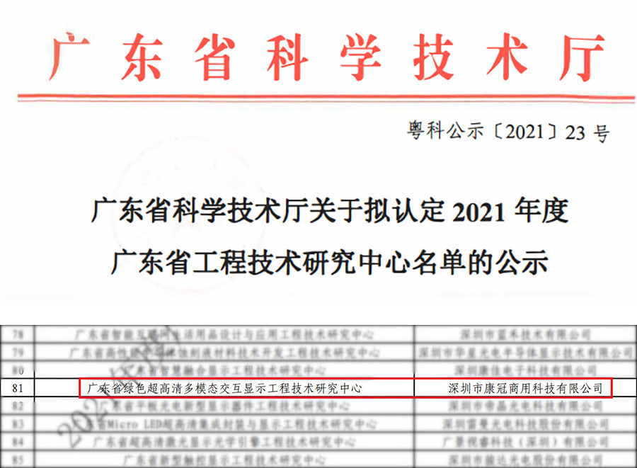 Through expert review and careful selection, Shenzhen KTC Commercial Display Technology Co., Ltd has recently ranked as Guangdong Engineering Technology Research Center for Green, Multi-Mode and Interactive Display with Ultrahigh Image Resolution in a 2021 Guangdong Engineering and Technology Research Center list released bytheDepartment of Science and Technology of Guangdong Province.