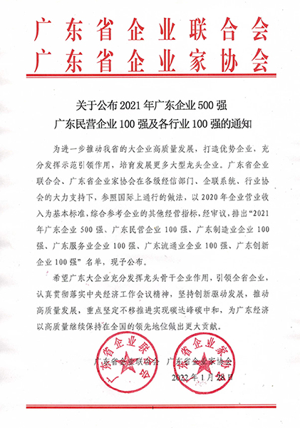 Cette série de listes vise à promouvoir le développement de haute qualité des grandes entreprises dans la province du Guangdong, à créer des entreprises avantageuses, à faire jouer pleinement le rôle de démonstration et de leadership, et à cultiver et développer davantage d'entreprises leaders à grande échelle.Par conséquent, la sélection Top 500 des entreprises du Guangdong a établi l'image de l'entreprise d'analyse comparative du Guangdong, promu l'excellent esprit d'entreprise, joué le rôle de premier plan dans l'industrie et constitue également un pilier et une référence importants de l'économie du Guangdong.