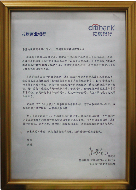 近期,我司被花旗银行(中国)有限公司授予了“花旗中国商业银行部2010白金客户”,这也是对6686体育网页登录公司优良信用表现的肯定。 据悉,“白金客户”将尊享高级客户经理与资深专家团队的专属服务,例如银行将会派遣资深专家定期回顾公司业务,同时根据我司最新发展状况,一对一度身提供方案与建议,为我司经营源源不断注入睿智与资讯。