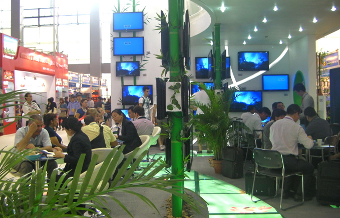 除产品外,我司的展位装修风格和设计也格外吸引眼球。展位地台上,一条发光带,模拟溪流,蜿蜒穿梭在展位内,从客户的脚下流过,点缀其间的金鱼,靓丽、跃动,给一个工业化的内容赋予了生命的活力与艺术的享受。葱茏的竹子和艺术干枝,将展位装扮得生机勃勃,所有这些为展位注入了生态与家装的概念,这在展览会的装修史上属于首例,它模拟出清新绿园的环境,清爽独特,给人以耳目一新的感觉,让客户留下了深刻的印象,更与“功夫熊猫”的演示片浑然一体。