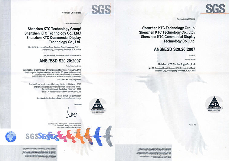2015年2月6日,深圳6686体育网页登录集团、深圳市6686体育网页登录技术有限公司、深圳市6686体育网页登录商用科技有限公司、惠州市6686体育网页登录有限公司均顺利通过SGS公司的ESD静电防护系统认证。这将意味着我们集团各工厂在制造领域的技术水平、安全生产与产品保护规范迈入新的台阶,提升至国际领先。