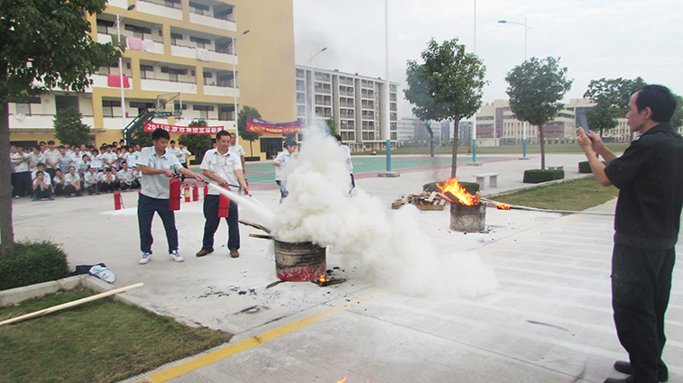 第二阶段由物业保安队长陈林和内保队长舒青改一一向大家示范介绍了干粉灭火器及消防栓的常规使用方法,随后现场随机挑选员工操作,两位保安队长在每一位员工操作结束后都会指出纠正操作中的错误和不当的地方。
