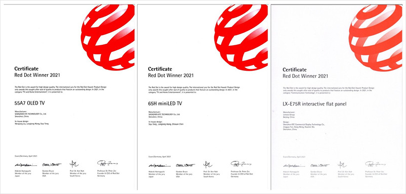 今年三月,2021年德国红点奖评选结果揭晓,6686体育网页登录公司自主研发设计产品65H miniLED TV 、55A7 OLED TV以及6686体育网页登录商用产品LX-E75R 交互电子白板荣获了享有“设计界奥斯卡”之誉的德国红点设计奖。近期,公司收到了由主办方颁发的红点奖证书。