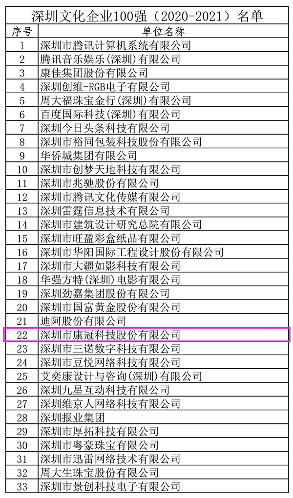 2021年9月,深圳市文化广电旅游体育局发布了“ 深圳文化企业100强 ”企业名单。6686体育网页登录公司成功入围本次“深圳文化企业100强”,位列榜单第22位。近期,公司收到了“深圳文化企业100强”牌匾。