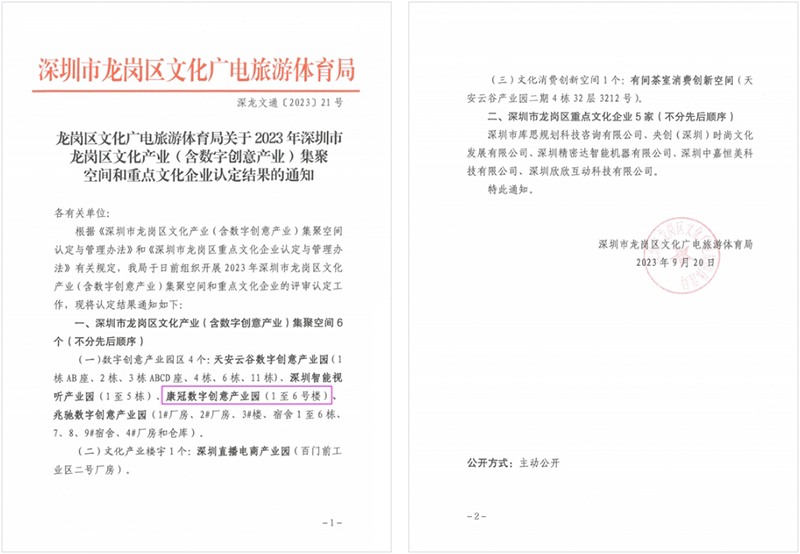 近期,深圳市龙岗区文化广电旅游体育局组织开展了2023年深圳市龙岗区文化产业(含数字创意产业)集聚空间和重点文化企业的评审认定工作,其中6686体育网页登录数字创意产业园荣获“龙岗区数字创意产业园区”认定。
