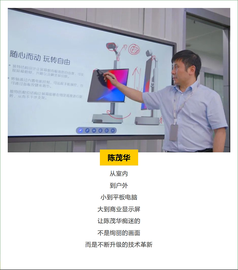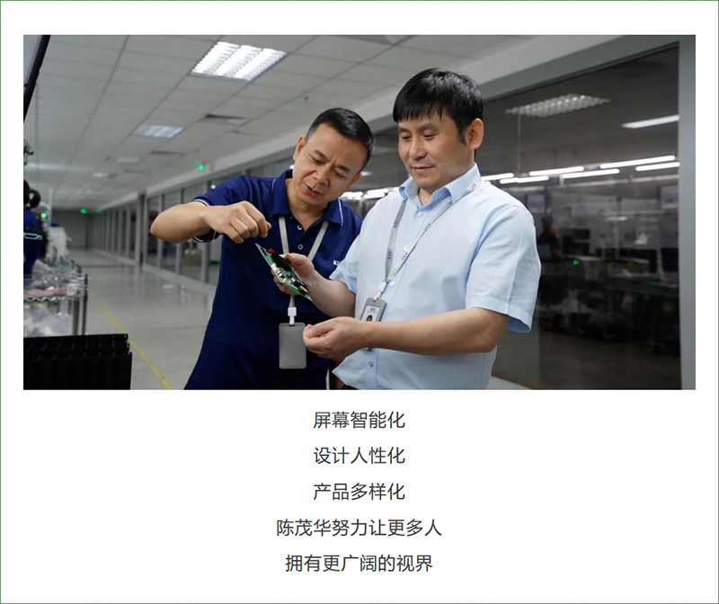 陈茂华牵头设计了公司旗下各类型3D电视、超薄全面屏液晶电视、巨幕LCD智能电视等专业类显示产品,并根据场景布局,优化公司旗下智能电视、智能交互平板等创新类显示产品,实现产品的跨领域应用。他不断探索创新,将显示设备与虚拟现实、3D、AI等先进技术深度融合,打造了多款AI智能交互体验产品,如AI美妆镜、智能运动镜、移动屏等,为用户提供身临其境的视觉体验。