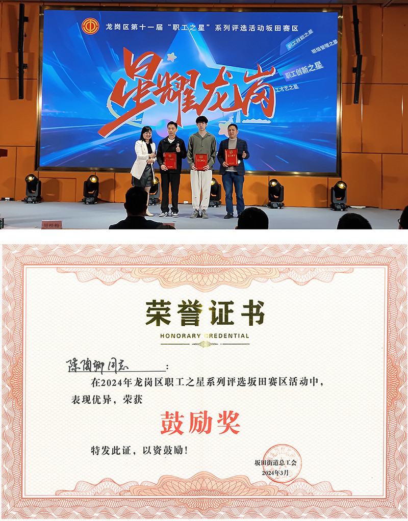 工程师陈佳威在龙岗区“职工之星”系列评选活动坂田赛区荣获“职工技能之星”优秀奖。